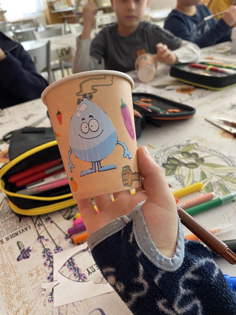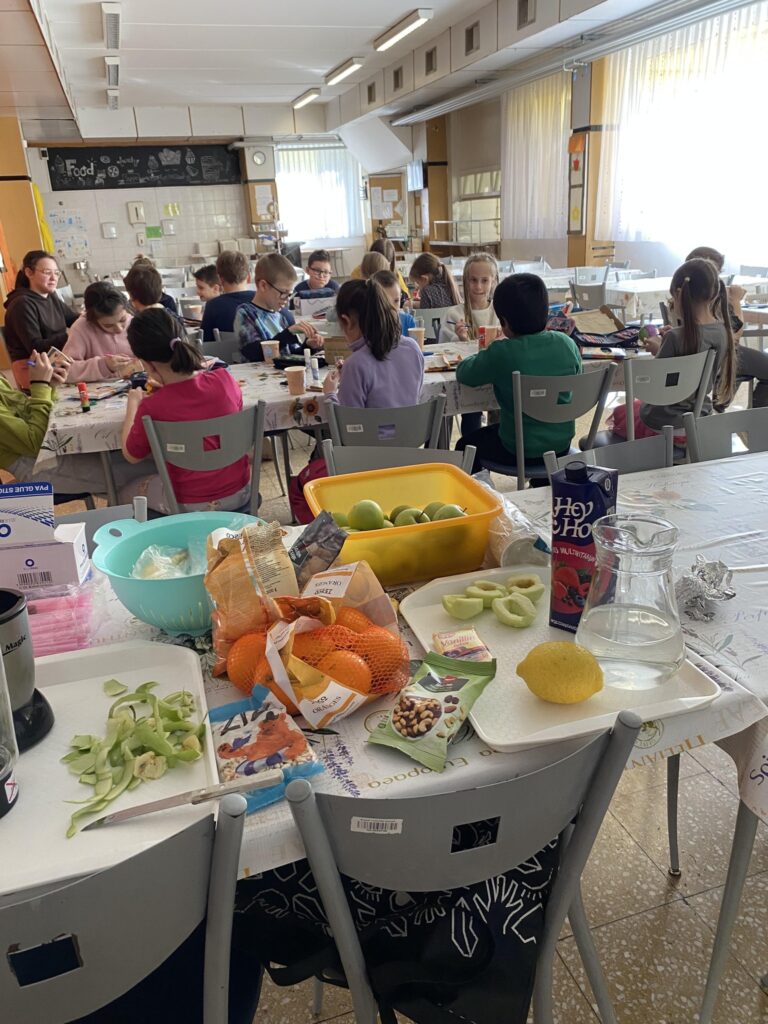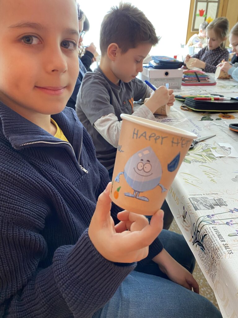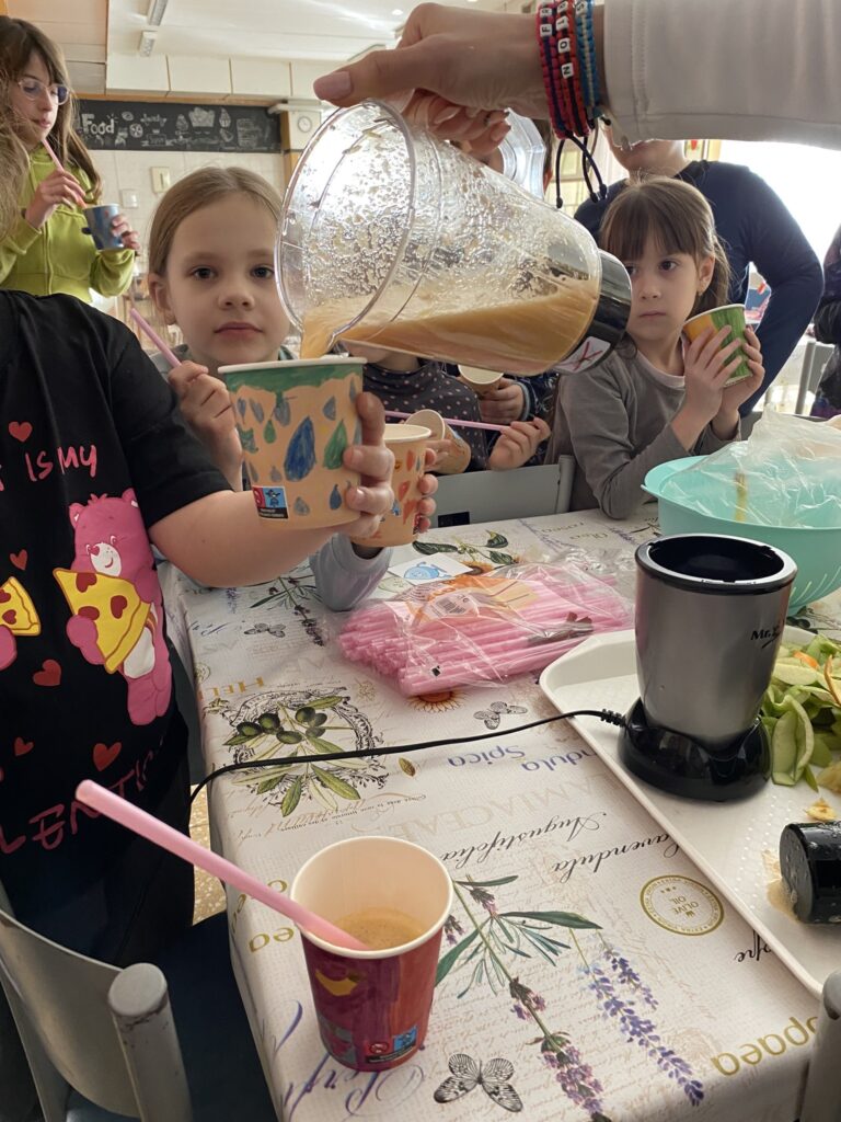 A Happy héten a kézműves szakkörön egy cuki poharat csináltak a gyerekek, majd az egészségtudatosság jegyében különböző turmixokat készítettek és azzal töltötték meg őket. Almát, almalevet, vizet, répát, banánt, narancsot, citromot kevertek a gyerekek egyéni kérése, ízlése alapján.