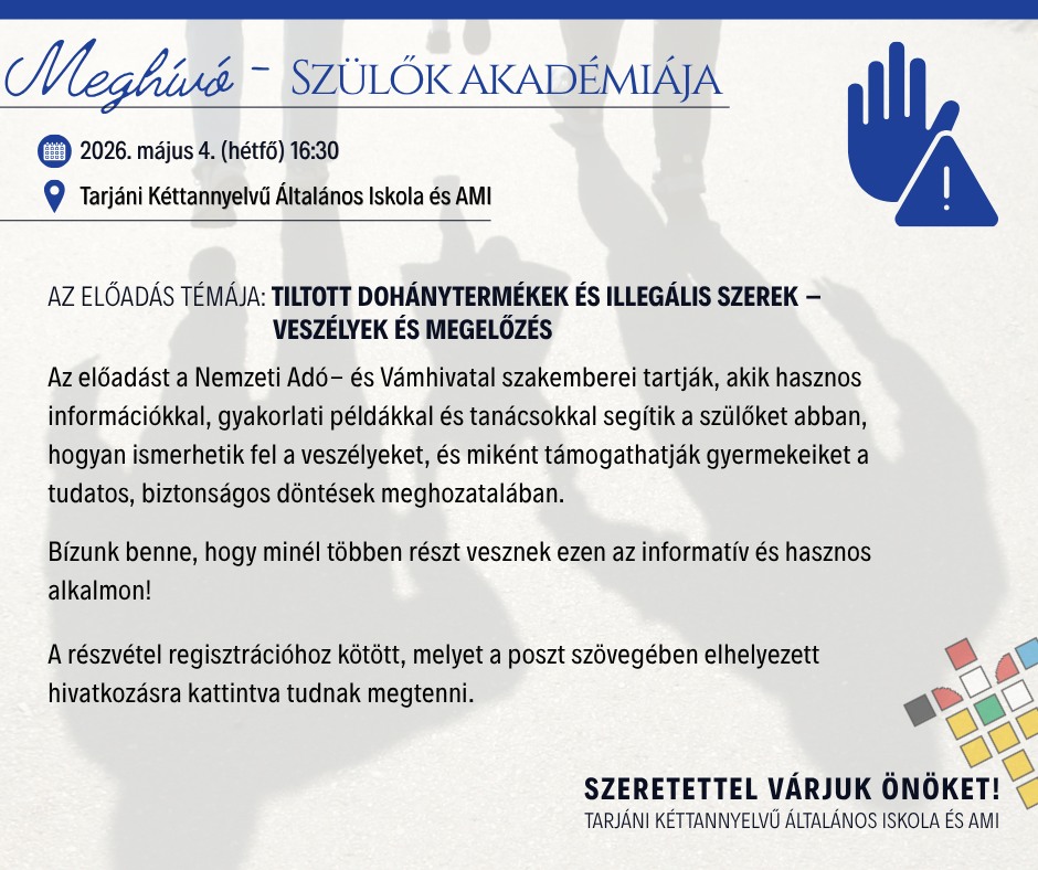 RendezvényeinkSzülők akadémiája Molnár Krisztián2026.04.22.2026.04.22.01 mins Minden érdeklődő szülőt szeretettel várunk! Jelentkezni az alábbi linken lehet: https://forms.gle/tH4cwxXsqkzLXmyQ7 Bejegyzés navigáció Előző: Szakköri lehetőségekKövetkező: Sakkfesztivál